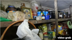 От частых обстрелов те, кто остался в Северске, прячутся в погребах. На полу – матрасы, на полках – продуктовые запасы, на стене – икона.