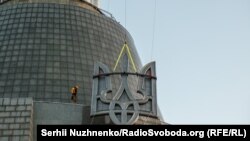 В Киеве на монумент "Родина-мать" установили герб Украины – трезубец, сообщает УНИАН.