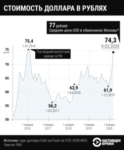 После обрушения цен на нефть курс доллара и евро к рублю взлетел на международном валютном рынке. Доллар рос до 73,29 рубля (максимум с марта 2016 года), евро – до 82,2 рубля (максимум с февраля 2016 года, когда в России был предыдущий валютный кризис). Сейчас доллар торгуется по 72,77 рубля, евро по 83,79.