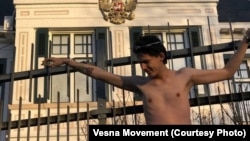 Активист надел на себя тогу, венок из колючей проволоки и приковал себя наручниками к забору посольства в позе распятия. Фотографии опубликовало движение "Весна", координатором которого является Кашеваров.