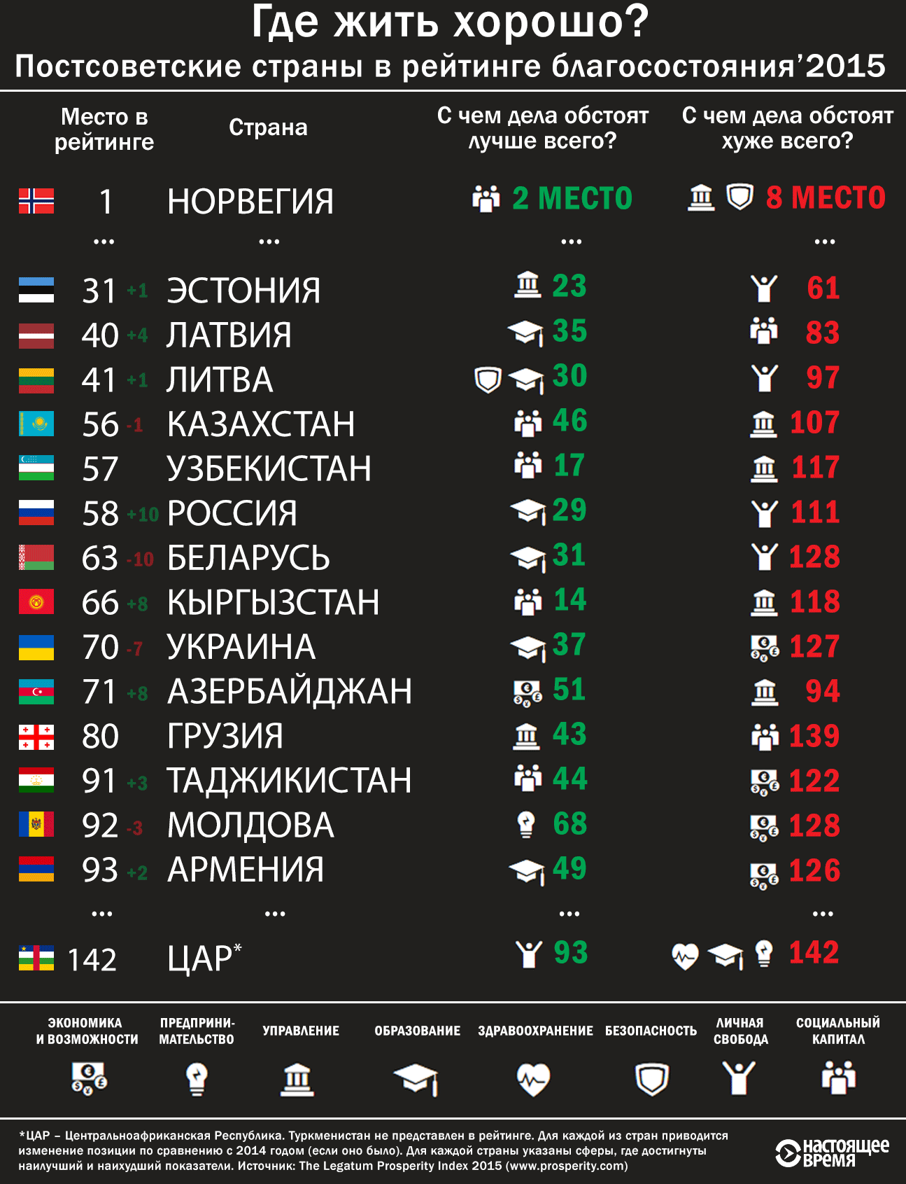 Занявшая первое место в рейтинге Норвегия и занявшая последнее место ЦАР (Центральноафриканская Республика) добавлены для сравнения. Туркменистан не представлен в рейтинге. Для каждой из стран приводится изменение позиции по сравнению с 2014 годом (если оно было). Для каждой страны указаны сферы, где достигнуты наилучший и наихудший показатели. Источник: The Legatum Prosperity Index 2015 (www.prosperity.com)