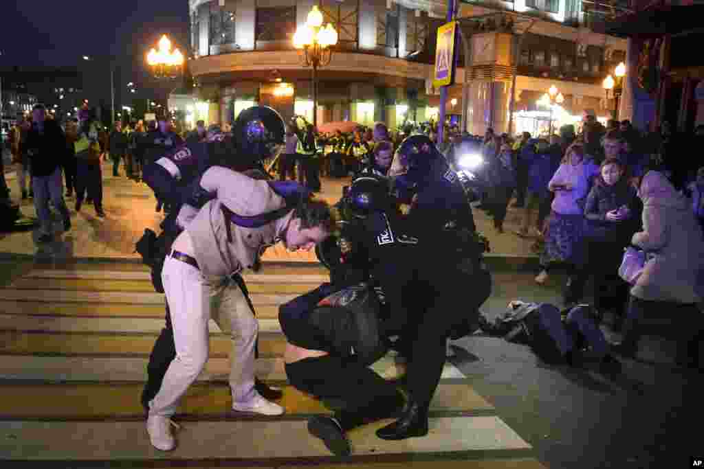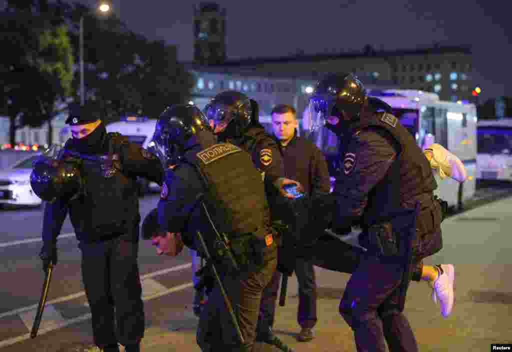 В Москве на акции протеста против мобилизации собралось несколько сотен человек, которые скандировали "Нет войне!" и "Путин – в окопы". Многие из них принесли с собой антивоенные плакаты. Практически сразу же силовики, которые дежурили тут до начала акции, начали задерживать митингующих