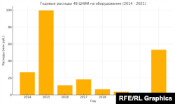 2016 по 2020 год траты института на лабораторное оборудование оставались стабильно невысокими, но резко выросли в октябре – декабре 2021 года, за несколько месяцев до начала нового строительства в Сергиевом Посаде-6. Только за три последних месяца 2021 года на оборудование было потрачено больше, чем за пять предыдущих лет суммарно. Данные военных закупок за период с начала 2022 года засекречены.