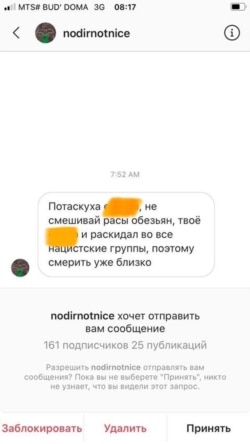 С расизмом в обычной жизни они почти не сталкивались, только Аниссу с Орфеем и его друзьями-африканцами не пустили в ночной клуб после свадьбы – без объяснения причин. Обе они подверглись травле со стороны МГ. "Несколько сообщений были с угрозами жизни, – говорит Анна. – Мы тебя найдем, тебе не скрыться, мы тебя порежем. Не думаю, что кто-то из этих людей может прийти и убить, но за здоровье было реально страшно". "Писали: "чернильница", "шлюха", что я сплю с обезьяной, желали болезни и смерти не только мне, но и моим детям", – рассказывает Анисса. Вместе с оскорблениями приходило и много сообщений поддержки, противники МГ спорили с его сторонниками в комментариях, все это превращалось в поток взаимных оскорблений. Анисса рассказывает, что нападавших на нее упрекали в том, что они прячутся за закрытыми профайлами, в итоге один из них открыл свою страницу, оказалось, что он работает в Росбанке. "Мои подписчики сразу обратились в банк, чтобы наказали этого человека. Банк попросил у меня прощения за него, сказали, примут это все во внимание, потому что их филиалы есть и в Африке, и сотрудники должны быть толерантными", – говорит Анисса.