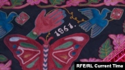 Гулзат Мукалиева, одна из авторов проекта "Ак Бата онлайн" и программный специалист фонда "Открытая линия", показывает кыргызский ковер, вышитый больше полувека назад: