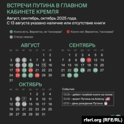С августа 2025 года Кремль опубликовал как минимум пять старых записей встреч Владимира Путина, выдав их за новые. Опознать подмену удалось по книжной полке в его кремлевском кабинете – на "консервах" нет сборника поэзии бойцов ВДВ, который впервые появился там 13 августа.