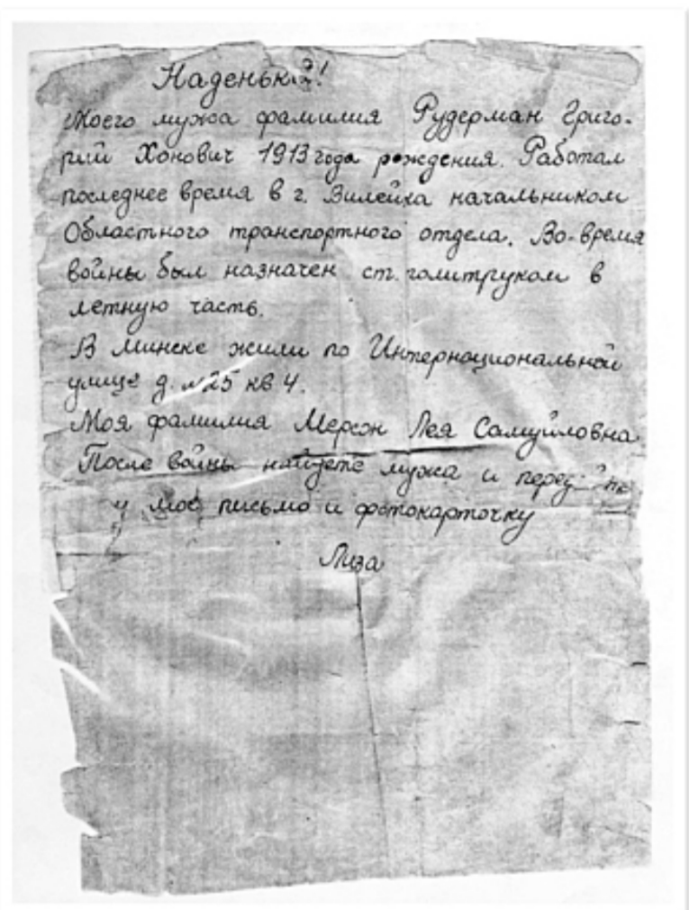 Записка для мужа, оставленная Леей Рудерман Надежде Крезо. Март 1943 года. Источник JewishGen, Inc.