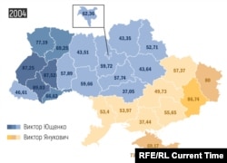 Во время президентских выборов 2004 года разделение на "Восток" и "Запад" было наиболее выразительным. Пророссийского Виктора Януковича поддерживали преимущественно регионы восточной и южной Украины, проевропейский Виктор Ющенко имел подавляющую поддержку в центральных и западных регионах Украины.