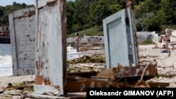 Коммунальщики и арендаторы пляжей ежедневно убирают побережье. Вывозят части бывшей херсонской жизни.
