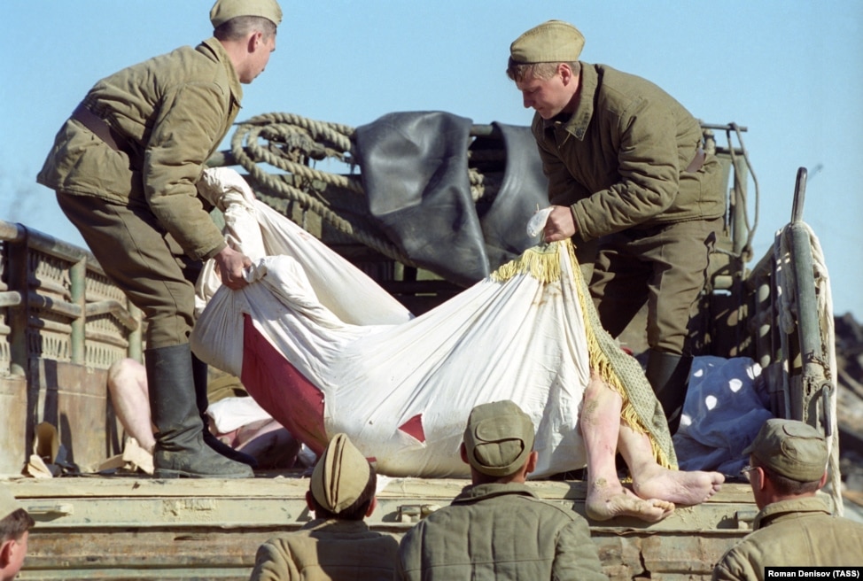 Тела погибших сначала укладывали возле развалин домов, а потом отвозили в холодильник, который находился рядом с профессионально-техническим училищем №6.