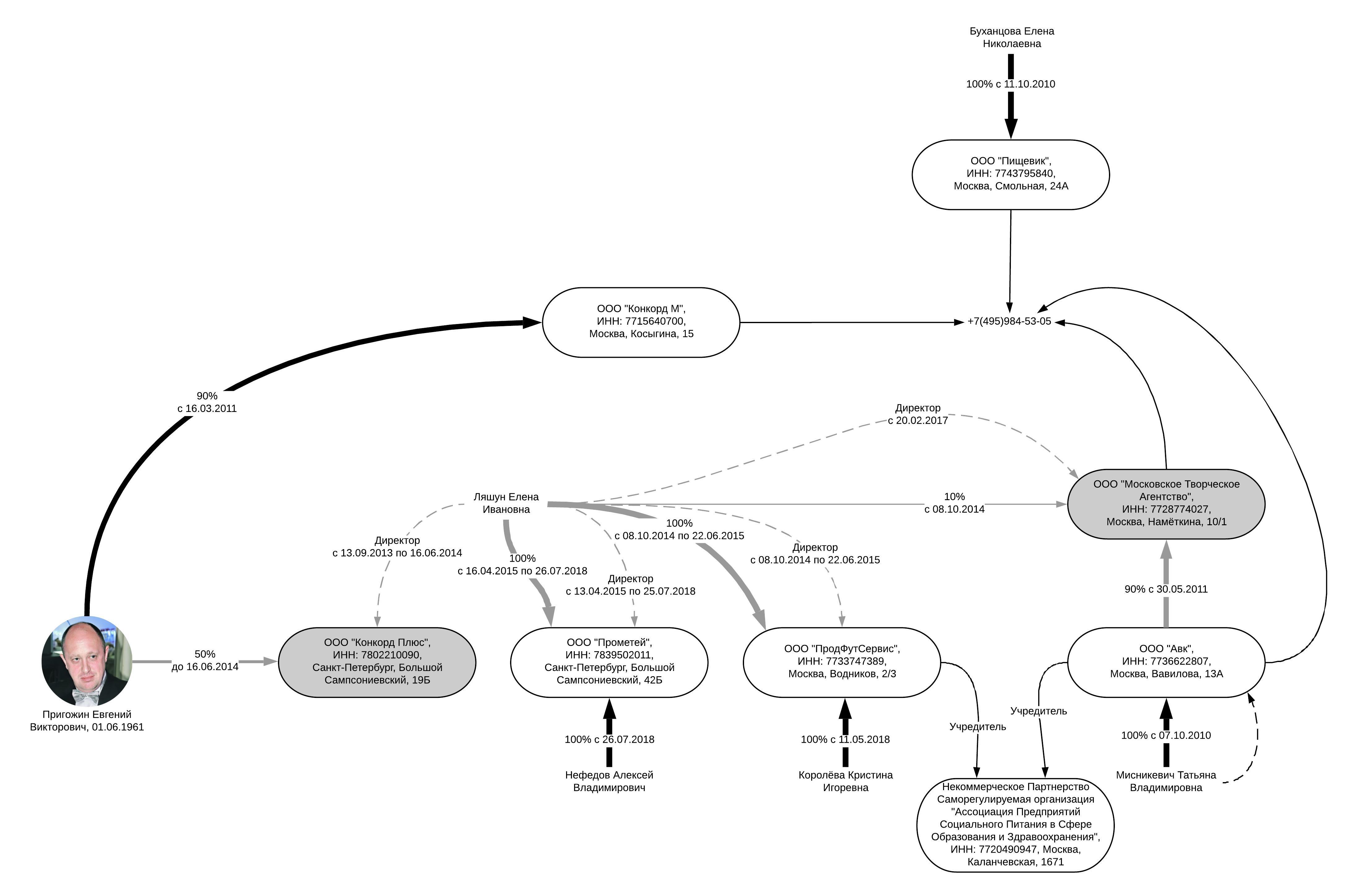 Примеры цепочек связей между компаниями Пригожина оказываются очень важными для понимания структуры бизнеса, который невозможно ухватить никакими точечными проверками и расследованиями. Слишком большую картину сложно удержать в голове — да и кому будет интересно разбираться в десятках ООО, которые получают госконтракты.